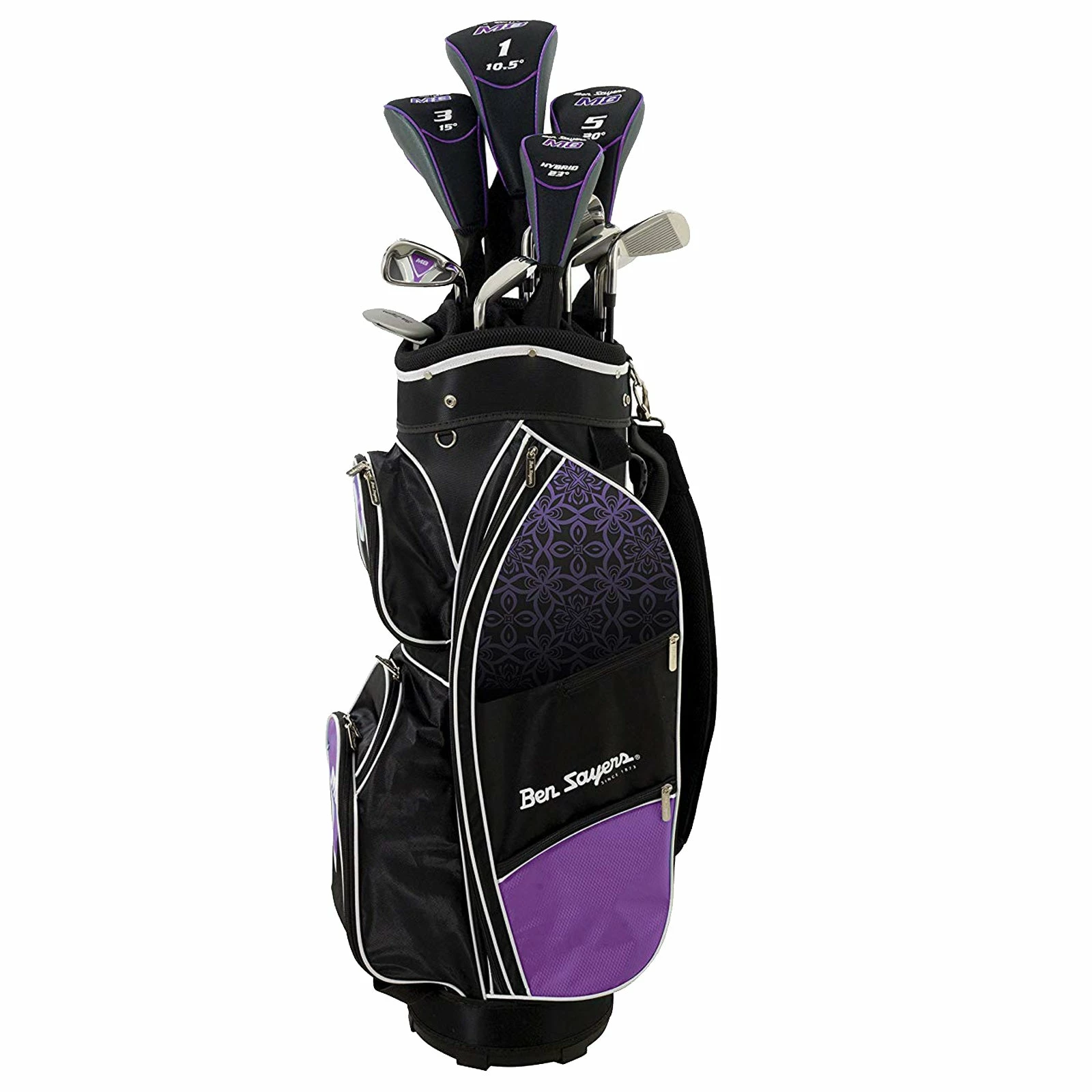 - Full set comes with: driver (12° loft), 3 wood (15° loft), 5 wood (20° loft), hybrid (23° loft), iron set (5-SW), putter & cart bag.